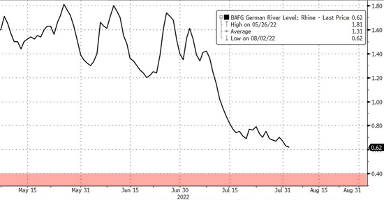 媒体指出,内河航运负担德国国内三分之一的原油、天然气和煤炭运输,占德国货运总量的5%到10%,而内河航运中约80%都依靠莱茵河水运。重要水运枢纽Kaub的河段低水位可能激化欧洲能源危机,甚至刺激通胀进一步走高,促使欧洲央行更激进加息。