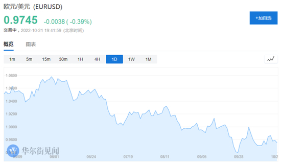 欧元兑美元下跌0.39%,现报0.9745。