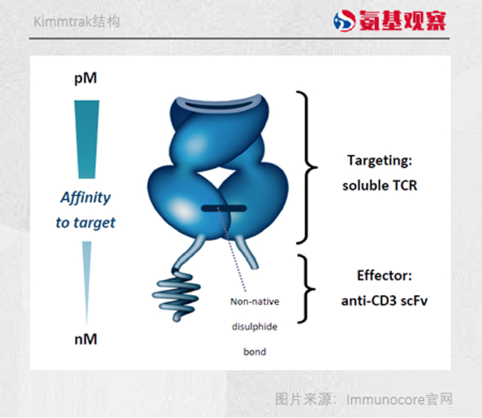 Kimmtrak是一种双抗,由工程化改造的TCR以及抗CD3的scFv组成。其中,经过工程化改造后TCR结构域能够识别并结合到肿瘤细胞表面,抗CD3抗体则会召集T细胞至肿瘤细胞周围。