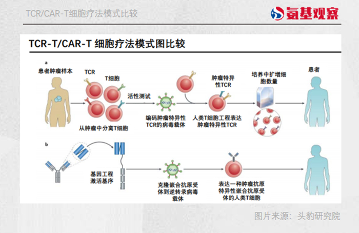 TCR-T疗法,则是直接改造T细胞结合肿瘤抗原的“探头”TCR,筛选出一些能够特异性识别肿瘤的TCR序列将其导入到T细胞中,使得原来不能识别肿瘤的T细胞能够有效地识别并杀伤肿瘤细胞。