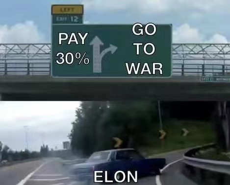 马斯克在推特上发布了一张高速公路标志的图片,上面有两个选项,即“支付30%的抽成费用”或“开战”,而标有马斯克名字的车辆向“开战”的方向行驶。