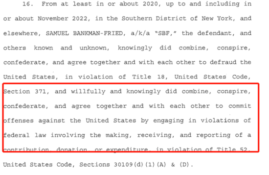 司法部对SBF的最后一项指控是,至少从2020年开始,SBF及其同伙明知故犯欺骗美国政府,违反竞选财务披露法。