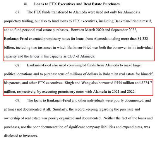此外,非法转移到Alameda的资金还用于向FTX高管,包括SBF本人提供贷款。