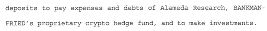 具体来看,SBF及其同伙挪用FTX客户的存款,并将这些存款用于支付SBF旗下加密货币对冲基金Alameda Research费用和债务,还进行了投资。