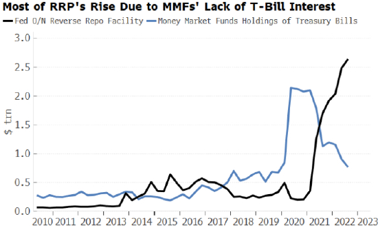 在理想情况下,存在以下两种可能。要么是MMF以国库券的形式购买这些新债,在此情况下,最终影响是隔夜逆回购协议(RRP)下降而银行准备金增加。或者,MMF持有人减持MMF资产,将所得款项存入银行,并利用存款来购买这些债券。实际结果依然是RRP下降而准备金上升。