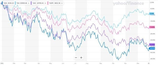 淡蓝色的道指表现相对最好,粉色为标普大盘,紫色为纳指,深蓝色为费城半导体指数
