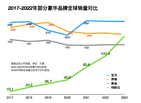 下图更加直观,特斯拉陡峭上升的销量曲线,让已经困在销量瓶颈多年的BBA如坐针毡。大胆预测,2023年,特斯拉全球销量将有望超越奔驰宝马和奥迪,成为全球最畅销的豪华品牌车企。