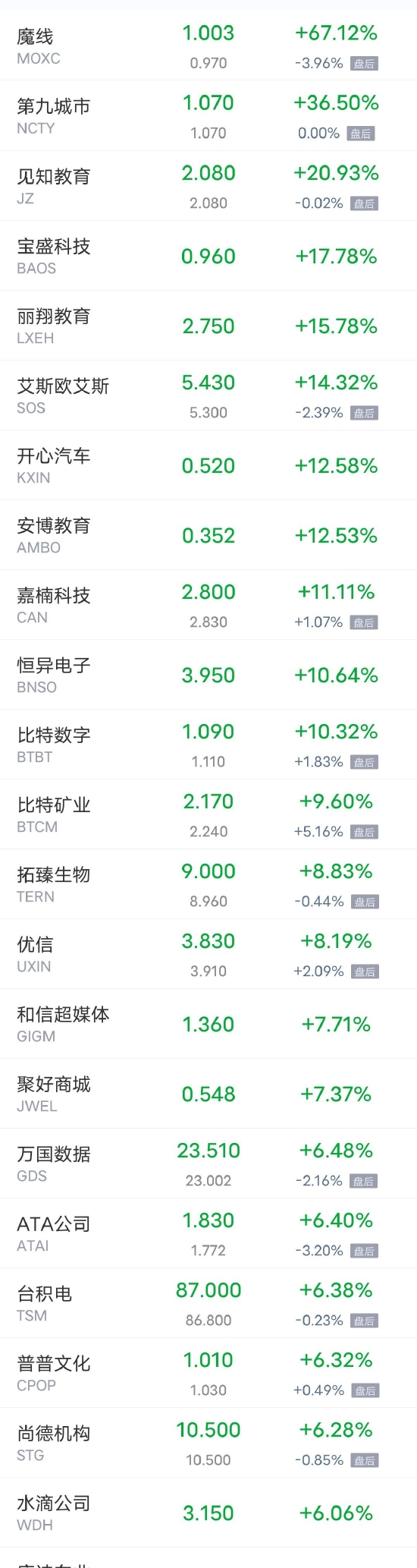 魔线涨超73%,第九城市涨超36%,见知教育涨超20%,宝盛科技涨超17%,丽翔教育涨超15%,艾斯欧艾斯涨超13%,开心汽车,安博教育涨超12%,嘉楠科技涨超11%,恒异电子,比特数字涨超10%,比特矿业涨超9%,优信涨超8%,和信超媒体,聚好商城涨超7%,万国数据,ATA公司,台积电,普普文化,尚德机构,优客工场等涨超6%。