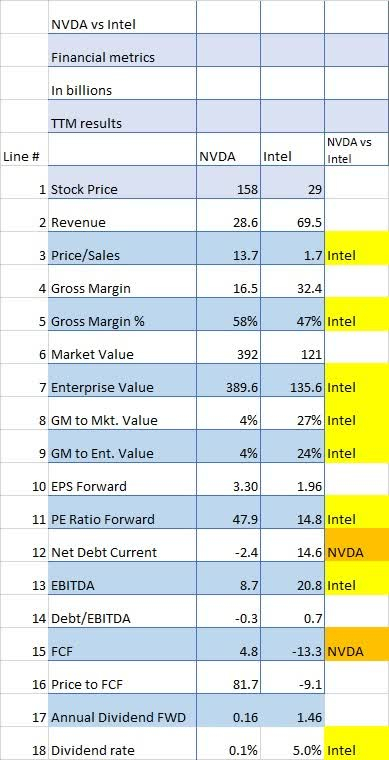 正如你在下表中很容易看到的那样,基于收入(第二行),英特尔是一家更大的公司。但当涉及到价格/销售(第三行)时,英特尔似乎具有更好的价值,其比值为1.7倍,而英伟达为13.7倍。