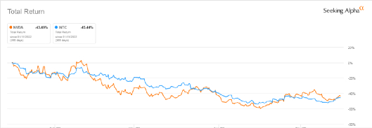 这两家公司有一个共同点,那就是去年他们都承受了巨大的总回报(股价加上股息)损失,英伟达同期下跌了44%,英特尔同期下跌了45%。
