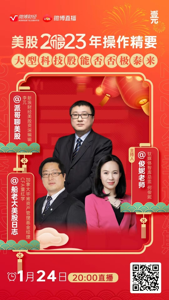 24日晚20点(初三),我们来聊一聊美股2023年操作概要,还有大型科技股能否否极泰来 ?钛媒体智库总监@俊妮老师 连线新浪财经美股编辑 @派哥聊美股、毕肯资产管理基金经理、CFA@船老大美股日志。我们一起讨论2023年美股的整体宏观背景,美股企业未来的基本面预期,还有近期美股低点反弹12%以上的后市研判...