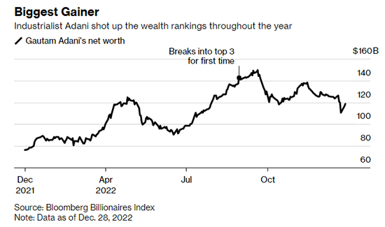 对于全球绝大多数顶级富豪来说,2022年必将是难以忘怀的一年。这一年,世界“首富”马斯克财富几乎腰斩、扎克伯格财富缩水近800亿美元……然而,并不是所有的亿万富翁去年都损失惨重——印度阿达尼集团的创办人兼董事长、亚洲首富高塔姆·阿达尼(Gautam Adani)在亿万富翁指数上超过了比尔·盖茨和巴菲特,为该榜单前十富豪中身家唯一获得增长的富豪。