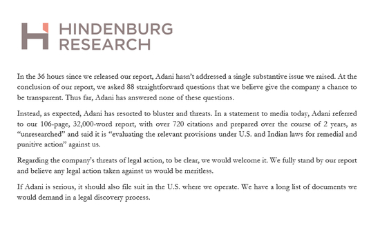 北京时间1月26日晚间,由于阿达尼集团尚未正面回应沽空报告的疑问,兴登堡研究进一步发推称,“在我们沽空报告发布的36个小时内,阿达尼没有解决我们提出的任何实质性问题。在我们的报告结尾,我们问了88个问题,我们认为(回答)这些问题能给阿达尼集团一个(变得更加)透明的机会。到目前为止,阿达尼仍未回答这些问题。”