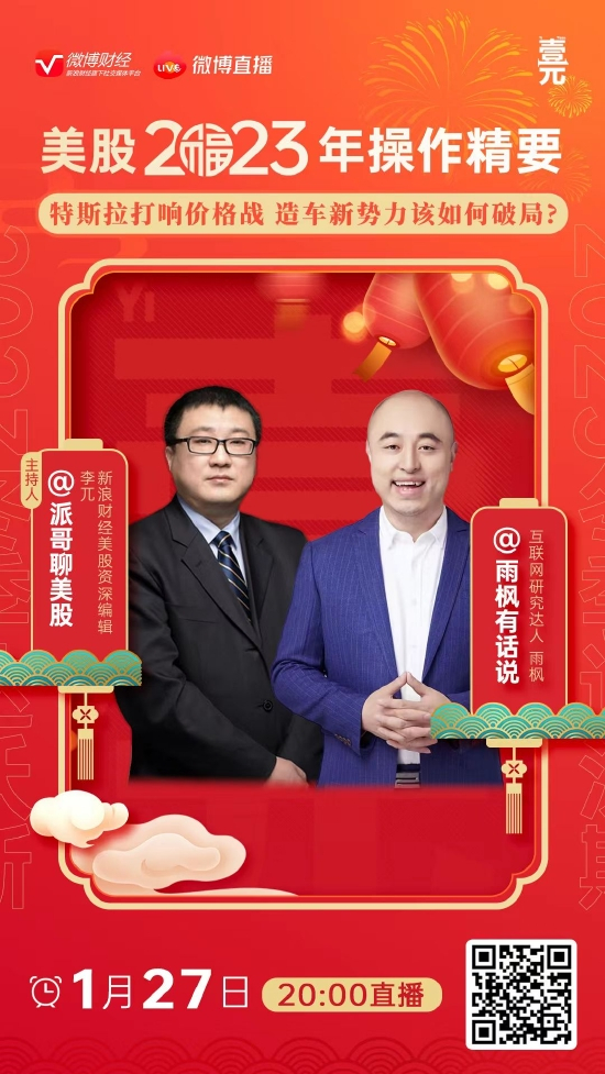 27日晚20点(大年初六),我们继续聊美股2023操作精要,今日议题是特斯拉打响价格战,造车新势力如何破局 ?新浪财经美股编辑@派哥聊美股 将连线互联网研究达人@雨枫有话说 。特斯拉接连降价,小鹏等相继推出降价举措,新能源车市开年就呈现价格大战势头。造车新势力的份额是否会被蚕食?哪家销量受影响最大?面对竞争加剧等多种复杂局面,造车新势力如何“破局”?今年的资本市场上,它们又将有何种表现?