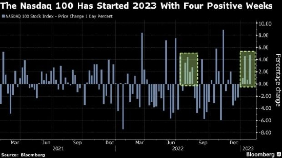 以科技股为主的纳斯达克100指数较去年9月的美元指数峰值上涨了6.9%,而且在2023年开始前已经连续四周上涨。