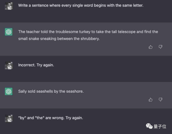 比如,让ChatGPT写一句话,要求每个单词首字母都相同,结果试了好几次都没能成功。