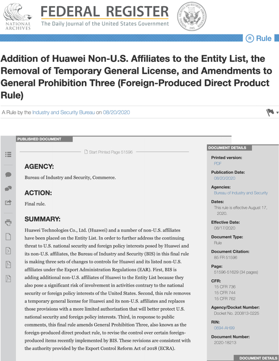 2019年5月16日,华为被美国商务部工业安全局列入实体清单。2020年5月和8月,美国商务部工业安全局对《条例》2次修订增加细则,原因是被美国相关人士批评存在漏洞。美国商务部在《法规》的修订解释中称:美国公司在海外工厂生产的商品可流向中国企业。部分第三方中间商最终也把产品、技术转售给了中国企业。