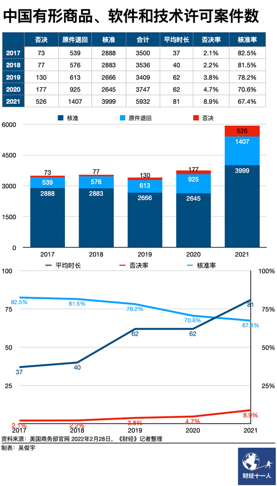 《财经十一人》查阅美国商务部官网对华贸易分析文件了解到,2017年-2021年,来自中国的商品、软件、技术许可案件数量近5年来缓步上升。但核准率从2017年的82.5%下降到了2021年的67.4%,且平均审核时长从2017年的37天逐渐演变为2021年的81天。