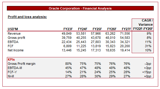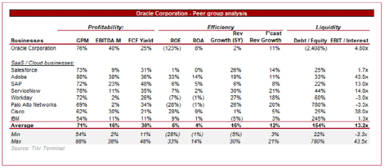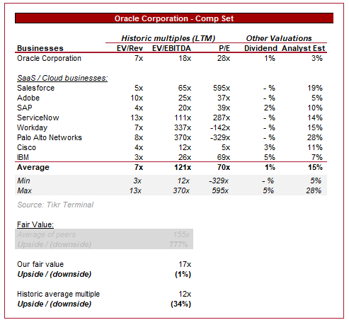 上面展示的是我们刚刚评估过的同行的估值。我们再次以这些企业的平均值作为基准。不出所料,这些同行的股价远远超过甲骨文。