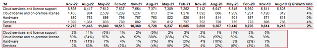 软件业务通常会产生大量现金,同时增长迅速。甲骨文在这两种情况下都表现不佳,历史增长是最大的驱动因素。在预测期内,这一差距会缩小,但业务仍低于平均水平。