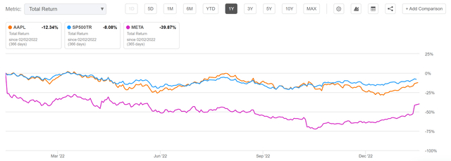 在比较苹果和Meta在过去12个月的表现时,可以强调的是,这两家公司的表现都低于标准普尔500指数。然而,苹果的表现明显好于Meta:尽管标准普尔500指数在过去12个月内的总回报率为-8.08%,但苹果在同一时期的表现为-12.34%,而Meta的表现为-39.87%。