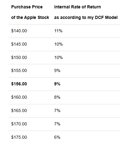 下面你可以看到用我的DCF模型计算的内部回报率,我假设苹果股票的购买价格不同。