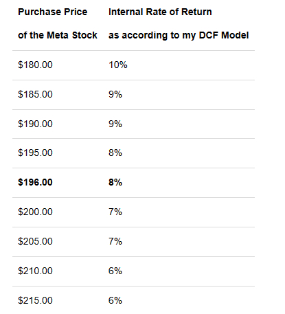 以Meta当前196.00美元的股价计算,我的DCF模型显示其内部收益率约为8%。