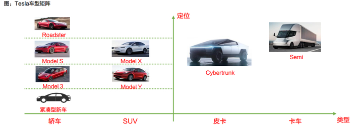 公开资料显示,特斯拉布局了新能源链条的各个环节,包括光伏、储能、电动汽车等。在乘用车方面,特斯拉通过先后推出Roadster、Model S/X、Model 3/Y等车型,自上而下切入大众市场;预计2023年将发布A级车型,价格进一步下探。在其他车型方面,特斯拉横向拓展,将品类拓展到皮卡Cybertrunk和卡车Semi。
