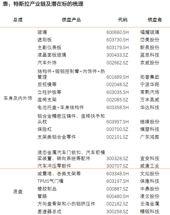 车身及内外饰包括福耀玻璃、岱美股份、新泉股份、蓝思科技、京威股份、拓普集团、宁波华翔、常熟汽饰、万丰奥威、华达科技、继峰股份、模塑科技、广东鸿图、宜安科技、威唐工业等;底盘包括文灿股份、保隆科技、中鼎股份、凌云股份、云海金属、精锻科技等。