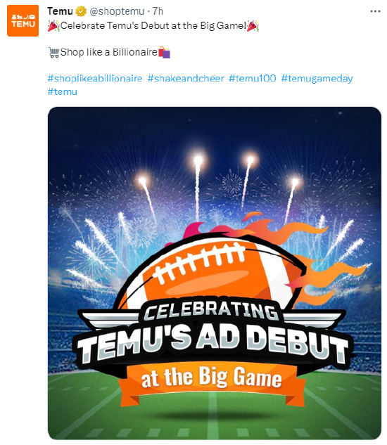新浪科技讯 北京时间2月13日下午消息,拼多多跨境电商平台Temu在本届超级碗放了一则30秒的广告,题为“像亿万富翁一样购物”。Temu成超级碗史上最年轻的广告品牌之一。