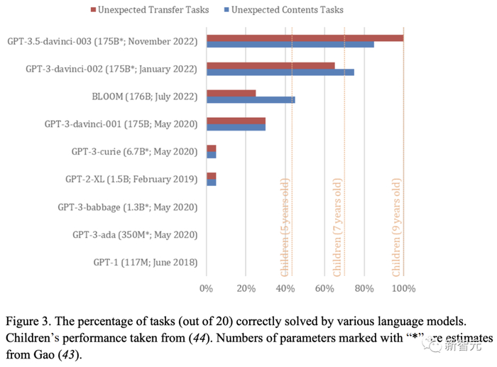 2022 年 1 月推出的 davinci-002 解决了 70% 的 ToM 任务,表现与 7 岁儿童相当。而 2022 年 11 月推出的 ChatGPT 表现接近 9 岁儿童。