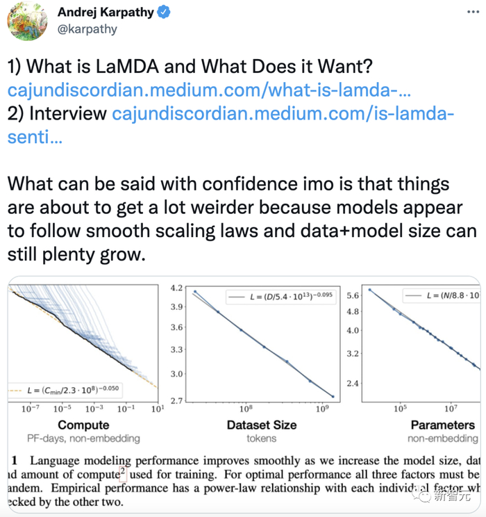 而特斯拉的 AI 主管 Andrej Karpathy 在 LaMDA 事件后也表示,‘我可以自信地说,事情将变得更加诡异。因为模型似乎遵循平滑缩放规律,并且数据 + 模型的大小仍然可以大量增长。’