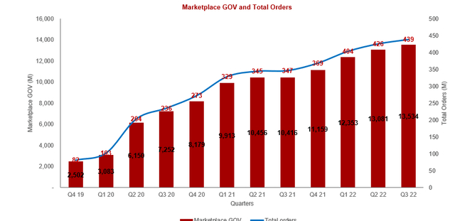 当我们更深入地研究销售额时,我们观察到Marketplace GOV和总订单都在放缓。上个季度的增长率只有3%,这可能意味着第一季度或第二季度将转为负值,这可能成为一个负面的催化剂。奈飞(NASDAQ:NFLX)的情况与此类似,当投资者看到增长陷入停滞时,该公司股价大幅下跌。鉴于我们预计2023年经济增长将放缓,我们相信DoorDash的全年营收很可能持平,但应该会避免负增长。