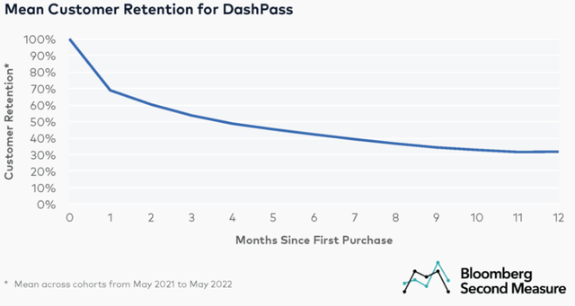 DoorDash的用户留存率一直比较适中,30%的客户至少会在网站上停留12个月。考虑到这些订阅通常带有登录奖金,预计会出现大量的初始下降。