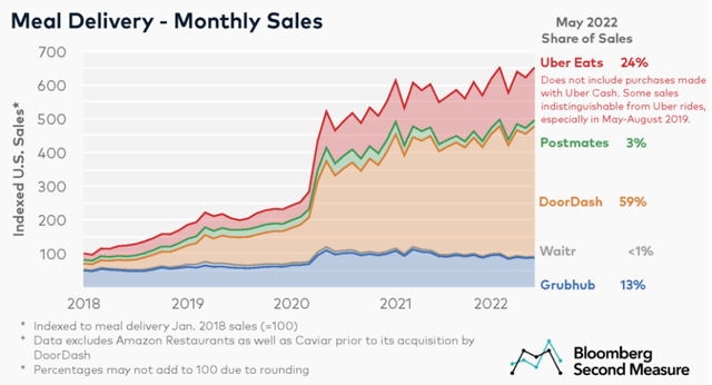 DoorDash看起来比同类公司发展得更快,增长率和利润率都高于平均水平。随着未来几年的整合和走向成熟,其中一些业务可能永远不会盈利,DoorDash是最有可能实现盈利的业务之一。作为美国市场的领导者,有证据表明,这是因为它们提供的产品质量,而不是靠亏损融资实现的激进增长。考虑到之前提到的保守融资,DoorDash在通过维持营销支出来获得市场份额方面处于有利地位,而随着融资成本的增长,竞争对手可能需要缩减规模。