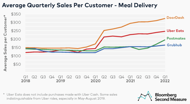 这个选择点很重要,因为如果消费者能得到他们想要的东西,他们就愿意花更多的钱。人们可能会认为,在市场上,客户的平均销售额是相对统一的,但事实并非如此,DoorDash的表现远远超过了它。这表明,他们的产品吸引了更多的消费者回来购买。
