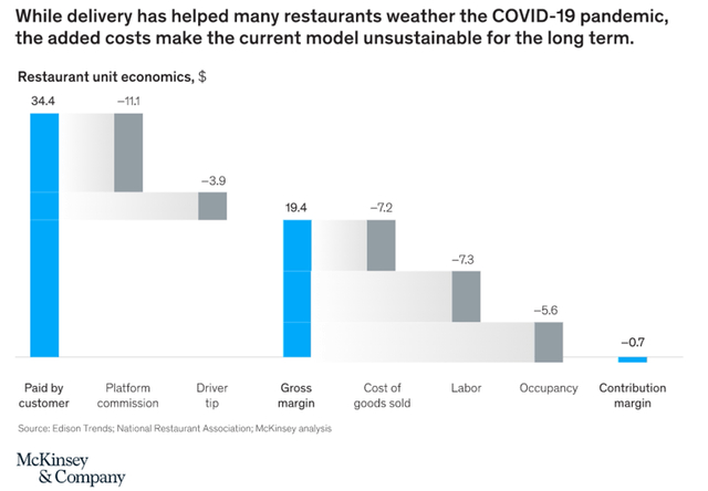 在这个行业中,发展与餐厅的关系至关重要,这也是DoorDash从一开始就关注的问题。Chipotle和Cheesecake Factory都公开将销售额增长归功于DoorDash,其中Chipotle 11%的销售额来自DoorDash。这是一个正面关系的例子,但一些餐厅对目前的定价模式不满意。送货正在侵蚀他们的利润率,可能还会蚕食利润率更高的面对面销售。正如麦肯锡所说明的,当前的定价模式是不可持续的。