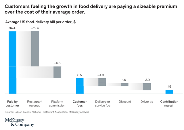 与餐厅价格相比,消费者目前为这项服务的便利性支付了相当大的溢价。在COVID-19初期和期间,这都不是问题,但我们看到需求放缓,消费者寻求更便宜的价格。如下麦肯锡的图表所示,为了支持快递业务的增长战略,消费者支付的价格远远高于商品的实际价格。