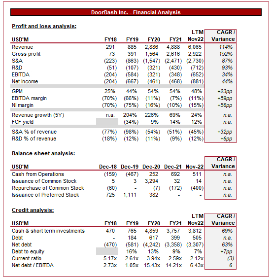 作为一项不断增长的业务,DoorDash的财务状况看起来非常好。营收的复合年增长率为114%,从11月22日到21财年的增长仍保持在可观的24%。