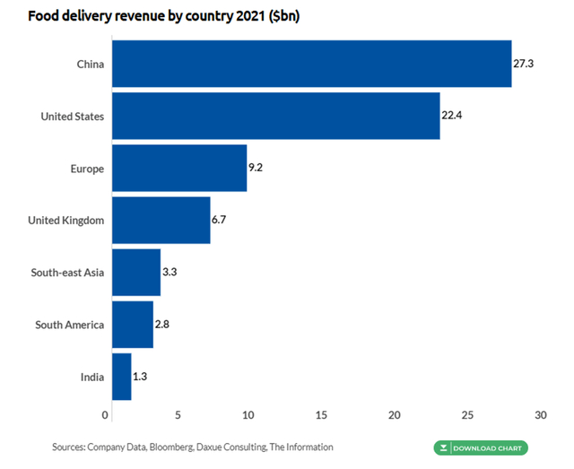 Food delivery revenue by region - 2021 (BusinessofApps)