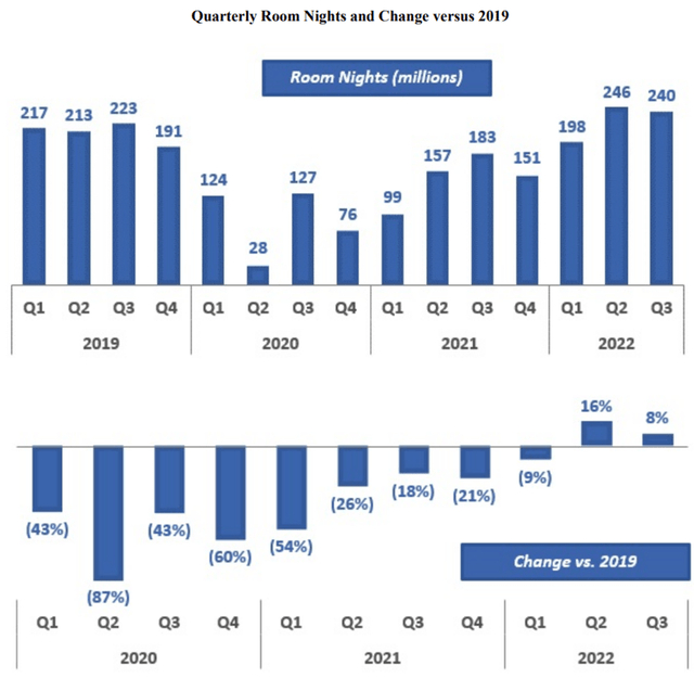 从下面的图表中可以看到,2022年下半年的客房夜量是如何恢复的,在第二季度和第三季度超过了2019年。