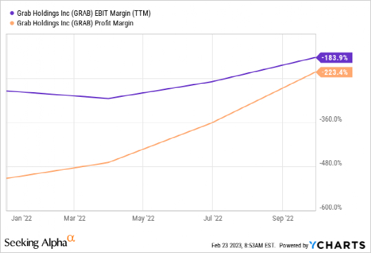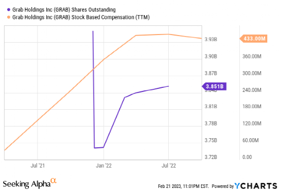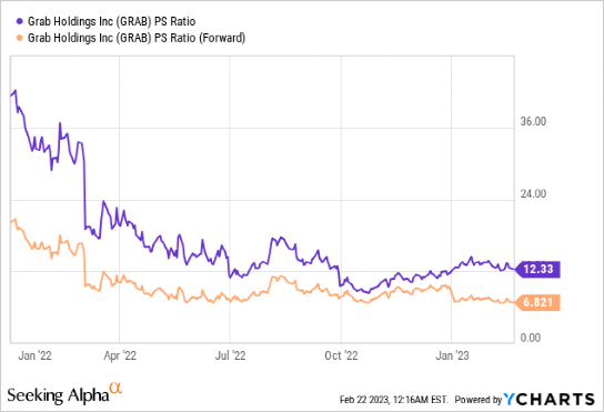 该公司目前的企业价值为90亿美元。市值为135亿美元,他们的现金比债务多得多。由于Grab Holdings没有正现金流,因此很难对其股票进行基本面估值。8.6的市销比(根据Seeking Alpha)相当高。在YCharts上,数字是不同的。基于2022年的总收入和市值,Seeking Alpha的数字非常接近。我认为使用市值而不是企业价值是有意义的,因为多余的现金很快就会用完。
