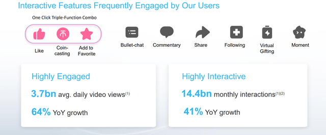 哔哩哔哩的用户粘性仍然非常强劲:在2022年第三季度,每位用户每天在该平台上花费的平均时间为83分钟。此外,视频日均浏览量同比增长64%,达到37亿次。