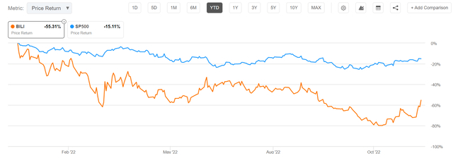 作为参考,哔哩哔哩今年迄今与标准普尔500指数(SPY)的表现差距仍然很大:BILI指数下跌了55%,而SPY指数“仅”下跌了15%。