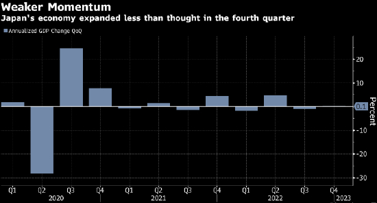 日本经济在截至12月的三个月中的扩张幅度低于最初估计,反映出日本面临的多重困境,包括全球经济放缓和通货膨胀。
