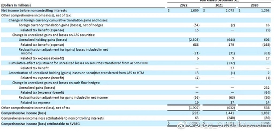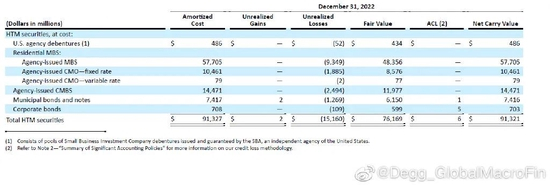由于SVB的资产购买集中在2020-2021年低息期间,因此AFS和HTM资产的平均收益率非常低。从10-K看,其AFS的平均收益率只有1.49%,HTM的平均收益率只有1.91%(图6)。伴随美联储2022年的快速加息,这些低息时期购买的AFS资产在2022年给SVB带来了超过25亿美元的未实现损失(unrealized loss,图7),而如果将1000亿以HTM计量的MBS的未实现损失考虑进去,总的未实现损失高达175亿美元(HTM unrealized loss大约150亿美元,图8)。