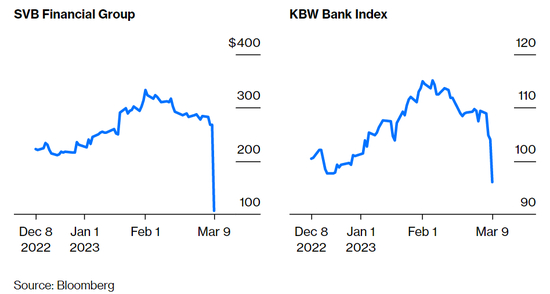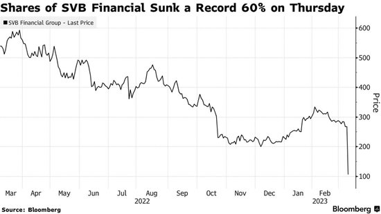 周四对美国银行业来说是糟糕的一天。基准KBW银行指数一度下跌8.1%,创下2020年6月以来的最大单日跌幅。该指数中跌幅最大的是硅谷银行的母公司SVB Financial Group,其股价暴跌60%。