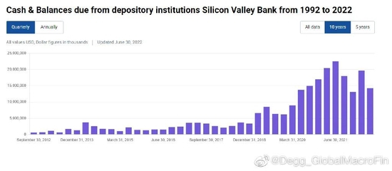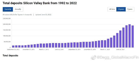 2020年下半年疫情担忧褪去后而美联储仍在承诺维持0利率很长时间,量化宽松持续进行,通胀也见不到影子,全球迎来了科技企业的融资热潮期,startups贷款和风投额度的快速增长使科技初创企业手里积累的大量的现金和存款,而这些存款很大程度流入了Silicon Valley Bank(下简称SVB)这一硅谷最重要的、也是全美前20大的银行。2020年6月至2021年12月的一年半期间,SVB的存款由760亿美元上升到超过1900亿美元,增幅接近2倍。