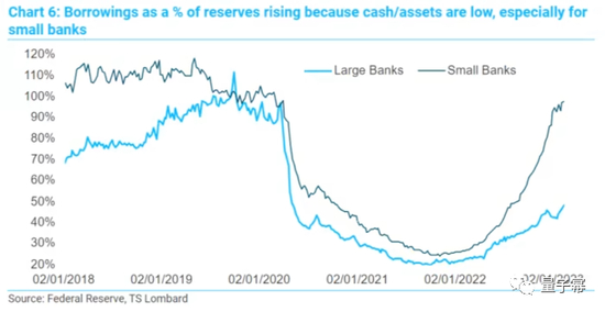 与此同时,由于持有的现金等资产较少,所有银行都在增加借款,然而,只有小银行的借款占储备的比例达到了新冠疫情爆发前的水平。