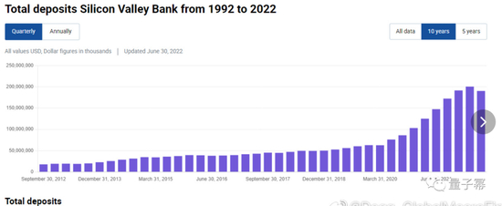 2020年下半年疫情担忧褪去后而美联储仍在承诺维持0利率很长时间,量化宽松持续进行,通胀也见不到影子,全球迎来了科技企业的融资热潮期,startups贷款和风投额度的快速增长使科技初创企业手里积累的大量的现金和存款,而这些存款很大程度流入了Silicon Valley Bank(下简称SVB)这一硅谷最重要的、也是全美前20大的银行。2020年6月至2021年12月的一年半期间,SVB的存款由760亿美元上升到超过1900亿美元,增幅接近2倍(图1)。